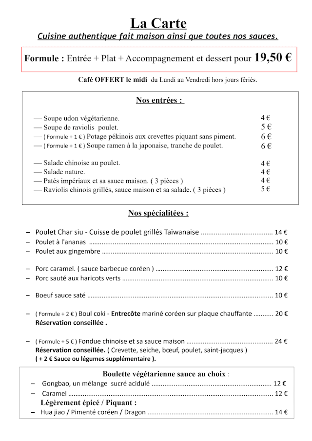 ChefNous vous proposons des spécialités asiatiques préparées directement lors de chaque commandes avec des produits frais et de qualités. Nous mettons tout en oeuvre pour vous faire découvrir une cuisine authentique et raffinée. Venez passer un agréable moment dans notre établissement en famille, en amoureux, entre amis ou collègues.