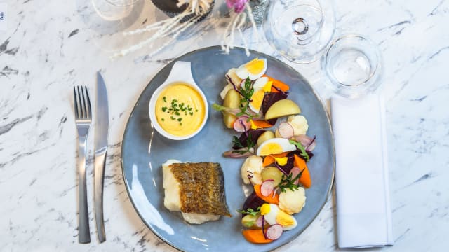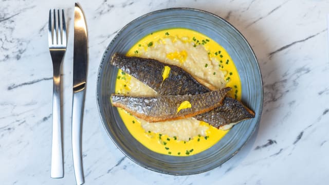 accompagné de petit épeautre, mini carottes et sauce beurre blanc