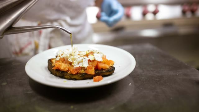 Fior di latte di ferrandina, melanzane a funghetto, pomodorino pachino, pomodoro marrazzo, burratina di ferrandina, basilico fresco e olio EVO