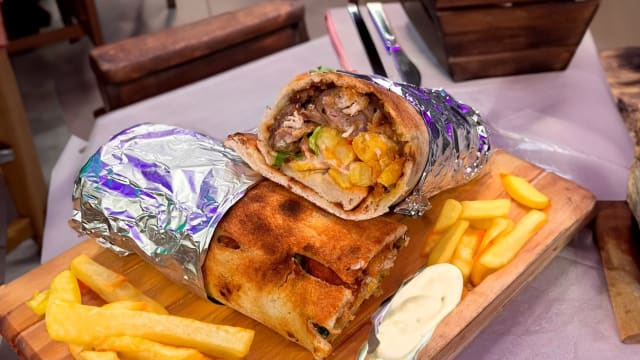 Kebab, cipolla, lattuga, pomodoro, patatine e salsa yogurt