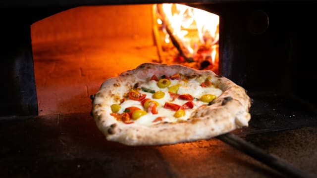 Crema peperoni, fior di latte di ferrandina, basilico fresco, melanzane alla griglia, champignon, zucchine, patate profumate al rosmarino e olio EVO