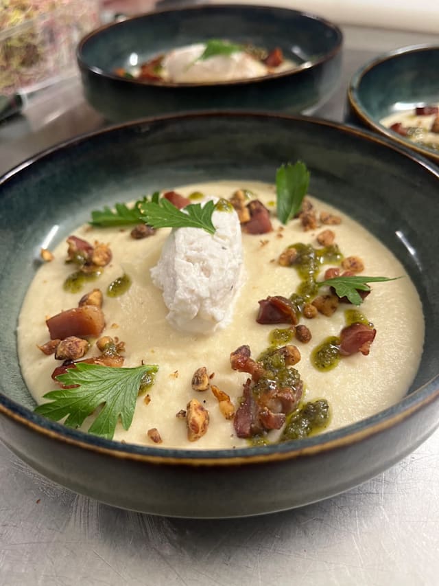 - Crème infusée aux cèpes, jaune d'œuf confit à l'huile d'olive