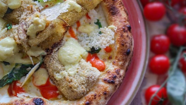 Base rossa di pomodoro san marzano strianese DOP, provola di agerola affumicata, fiori di zucca, basilico, grana padano 18 mesi, in uscita: fior di ricotta della latteria sorrentina, capocollo casertano ed olio evo.