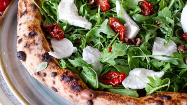 Base bianca, fior di latte di agerola, olive nere caiazzane, prosciutto cotto arrosto, pomodorini semidry, funghi, salame napoli, carciofini arrosto, basilico e olio evo.