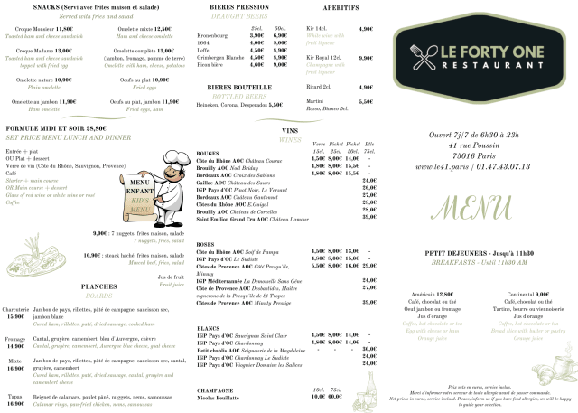 8/10This is a good value restaurant that coped well under the pressure of a lot of people wanting to be fed in a short time ahead of the Olympic Boxing at Roland Garosse. Well done to the team at Forty One!