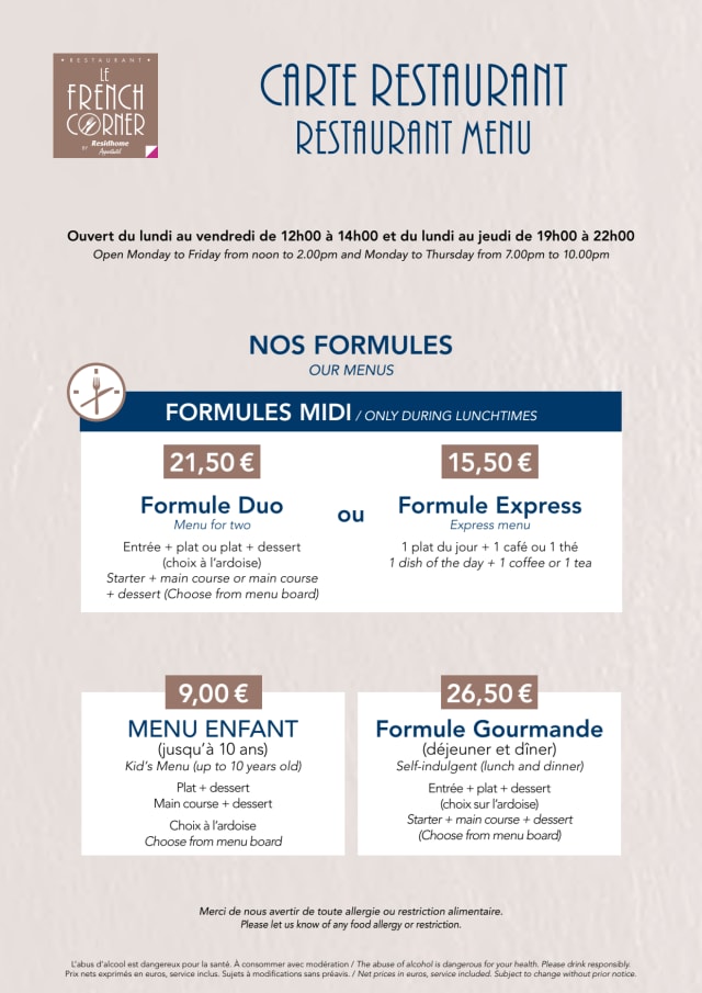 Yes, Le French Corner (by Residhome) is offering 20% off the 'a la carte' menu Reserve your table and enjoy your special discount now on TheFork!