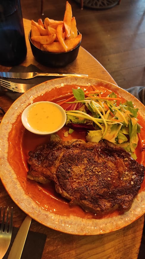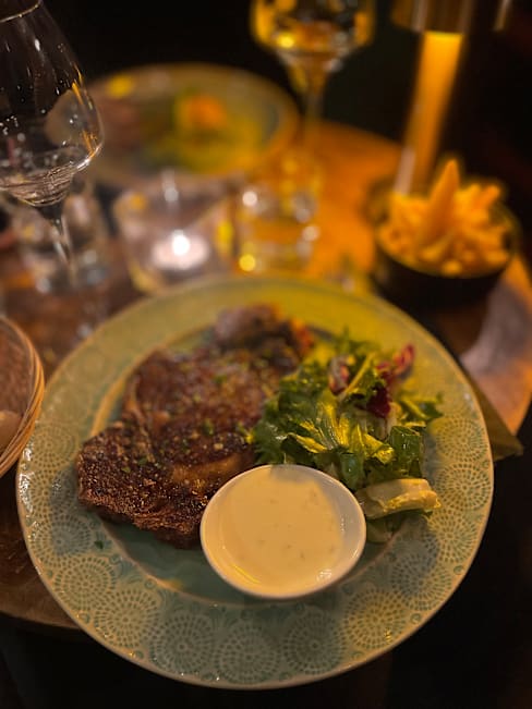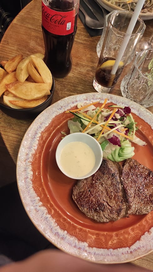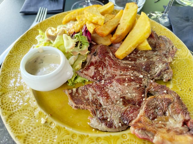9.5/10The steak was cooked beautifully and was very tender, the fries were delicious and the crème brûlée for dessert was wonderful. The waitress helped me translate the menu into English and even though she was the only one working, provided excellent service. Highly recommended!