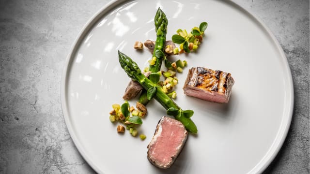 - Roasted Landes white asparagus, veils of smoked duck breast, FAUCHON mango confit with Sechuan pepper and puffed buckwheat (vegetarian option available )