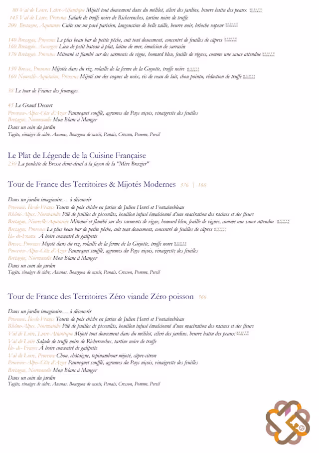 10/10A real gem of a restaurant, the chef owner Jean François Piège has elevated every morsel of a Tour de France menu into a precious jewel, taking guests to a sensational culinary voyage. We were very impressed by the high level of creativity, the chef's approach to taste, the flavors, the presentation, everything. Wine lovers will never have enough time to pick thru the encyclopedic French wine list, while Chartreuse "amateurs" like me will never guess how much of a treasure is hidden there in plain sight. Expensive yes, but it will be a very special moment you'll never forget, well worth it. I would not be surprised the 2 Michelin stars (macarons) turn into a rating of 3, at least I wish it to JFP and his team.