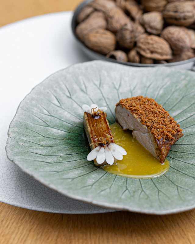 - Mijoté sur des coques de noix, ris de veau de lait, chou pointu, réduction de truffe
