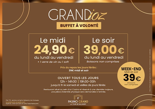 Le Grandioz - Pasino Grand La Tour de SalvagnyBonjour, Merci beaucoup pour votre retour ! 😊 Nous sommes ravis que votre expérience ait été positive et que vous ayez apprécié votre visite. À très bientôt ! L'équipe du Grandioz 🍽️