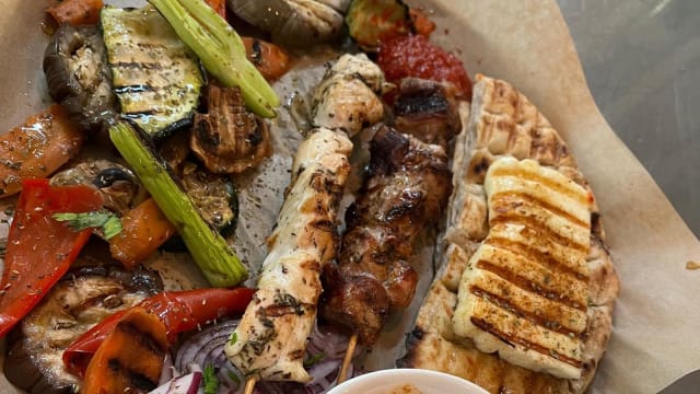 Légumes grillés avec pain pita, tomates, frites, oignons rouges, persil, sauce au choix