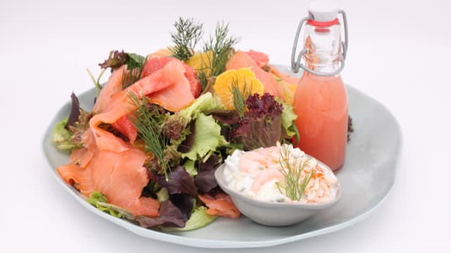 Sauce: huile d'olive vierge extra, vinaigre balsamique, huile de noix