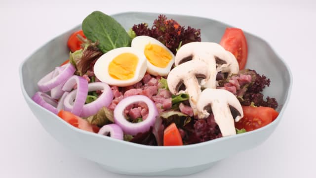 Salade mesclun, lardon grillé, champignon de paris, oeuf dur, croûton à l'ail, oignon rouge, tomate cerise, origan