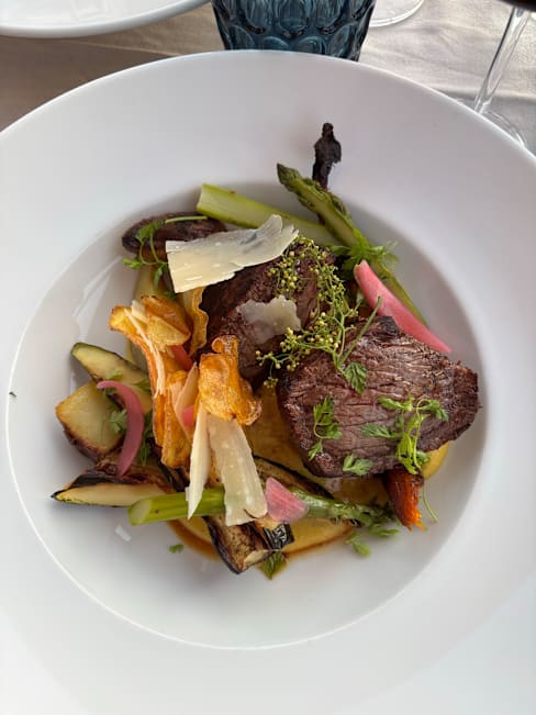 8/10The view and service were outstanding. I ordered the steak to be cooked medium rare but it was more on the well done side. My partner is gluten sensitive and she had very few choices. I had a deconstructed Tiramisu which was good. All-in-all an average culinary experience.