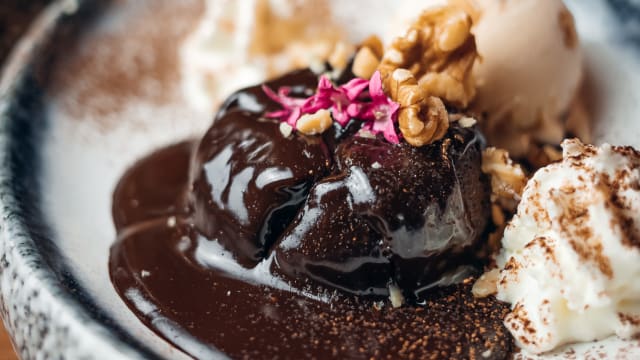 Brownie gourmand au chocolat noir, caramel beurre sal, glace macadamia et crème fouettée
