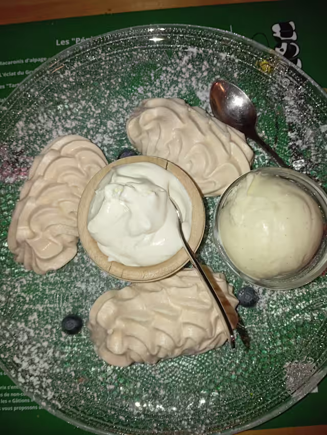 - soupe du chalet, macaronis d'alpage, meringues double-creme de la gruyére ou griottes au kirsch