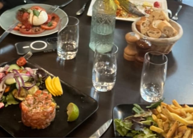 8/10Food is good, wine as well. Comfortable seating. But water glasses were really dirty