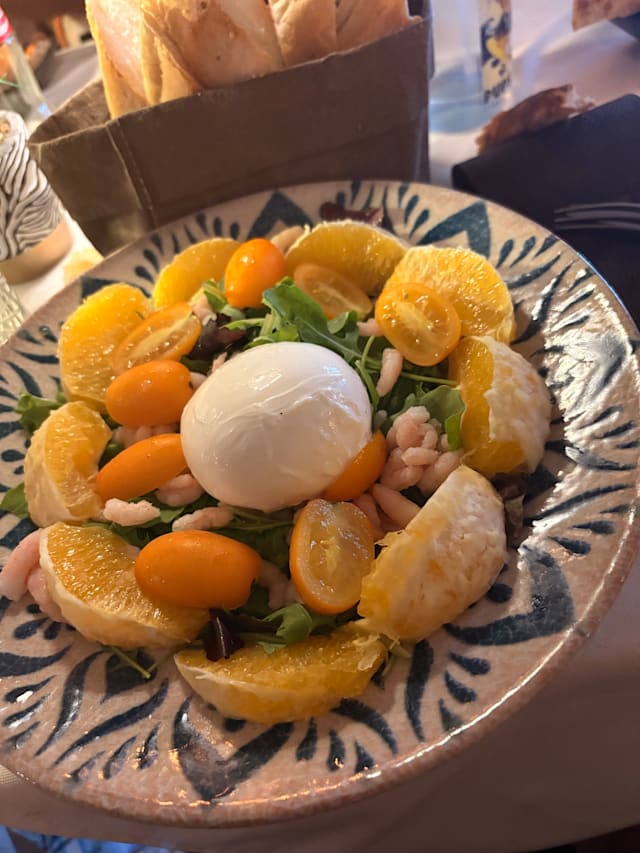 (Misticanza, pomodorino ciliegino, gamberetti, arancia e burrata)