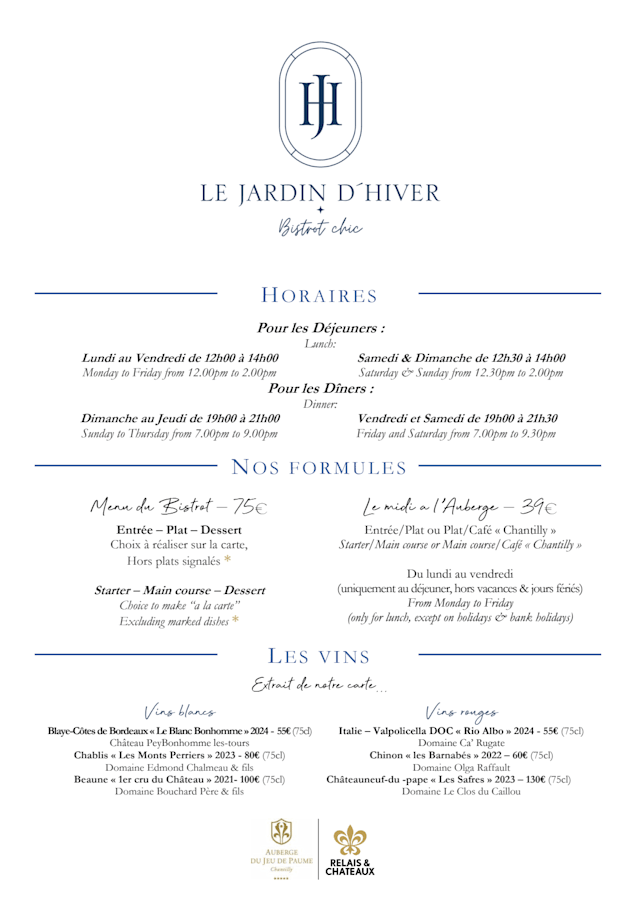 Dear Sir, We would like to thank you for sharing your comments with us. We are saddened to read that your experience in our restaurant, Jardin d'Hiver, did not reach your expectation. The feedback of our customers being of the utmost importance for us, be reassured that we have passed to our Chef your comments in order to improve our service. We truly hope to have the pleasure of welcoming you again to the Auberge du Jeu de Paume, and we remain at your disposal for any assistance you may need. Sincerely, Quality Manager