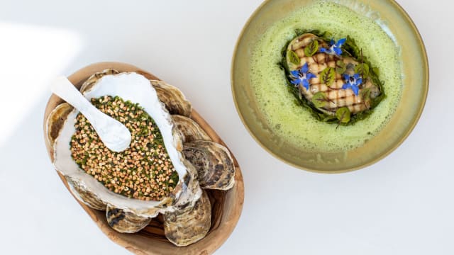 Crémeux verveine du jardin, sorbet aux herbes et vinaigrette yuzu
