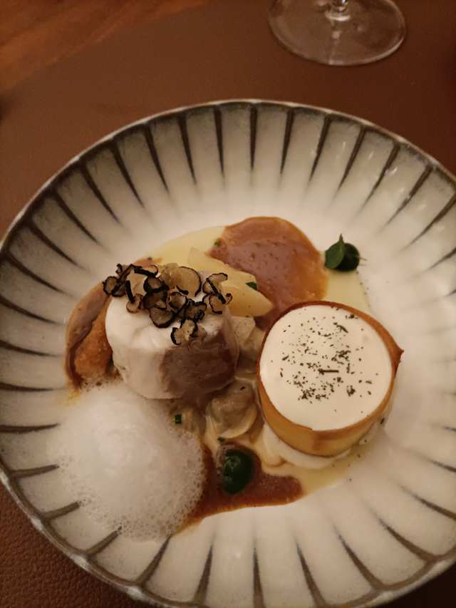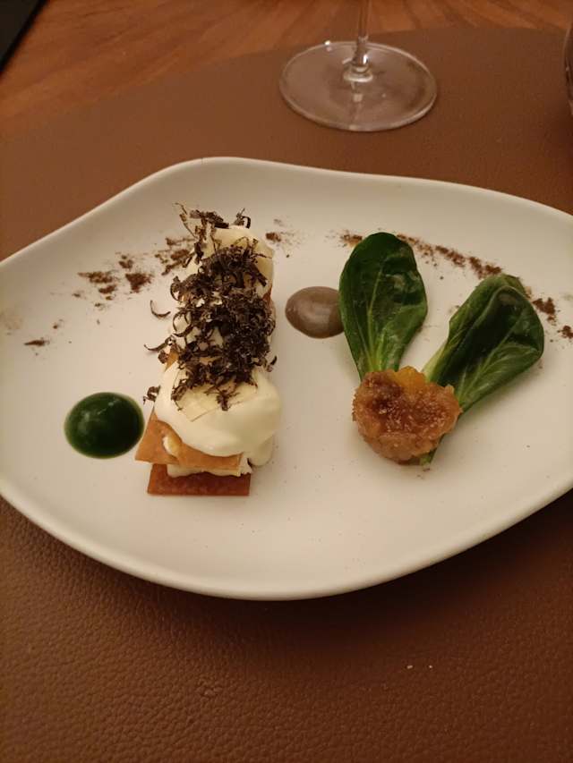 - Poached turbot fillet with a black truffle (Tuber melanosporum) scale crust, served on a truffled potato risotto with smoked bacon, tangy roast jus, candied baby gem lettuce, and parmesan foam