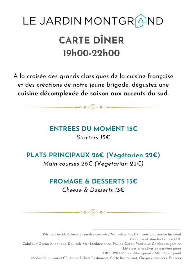 10/10We were a group of five at a Saturday lunch before a big sports event. The restaurant is perfectly located in the heart of old Marseille (near the Vieux Port) but you are completely hidden from the noise and how busy the area is. The food was really great. It was a set menu (Plat du jour) of three choices - meat, fish or vegetarian. Good quality food, well prepared and with great presentation and correctly priced. The service was excellent - attentive, quick and friendly. I would highly recommend Le Jardin Montgrand.