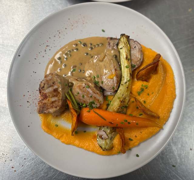 - Pièce de boeuf d'environ 180 gr braisée, polenta crémeuse et jus corsé.