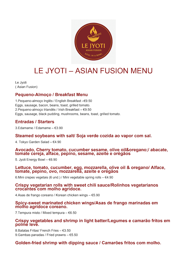 10/10The food at Le Jyoti was amazing. We had Pork Boa Buns and it was delicious. The pork was crispy and it came with hoi sin sauce with lettuce and tomatoes. I would recommend the Boa Buns. The Korean chicken wings was nice and crispy and it came with a sweet chilli dip which was complemented the chicken. The owner Bissnu who served us was very helpful he recommended some sauces to go with the food we ordered. The restaurant interior is so pretty, when you walk in you see lots of pink cherry blossoms and Chinese lanterns all lit up. I would recommend this restaurant for their excellent customer service, their hospitality, professionalism and the quality of the food. Please see photos of the food which we all thoroughly enjoyed. Thank you to all the staff at the restaurant and also to Bissnu. We will definitely return when we visits Portugal next year. 😊