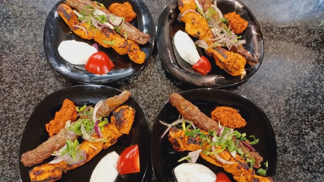 1 brochette de kafta, 1 brochette de poulet, 1 brochette d'agneau, (crudités + frites) ou riz.