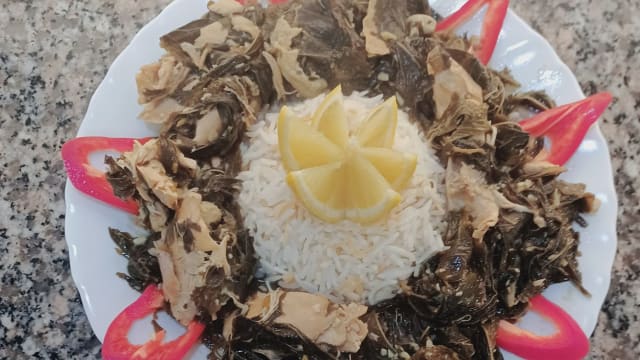 5 entrées froides. 5 entrées chaudes, 1 plateau de grillades mixtes. servi avec galettes libanaises et dessert maison.