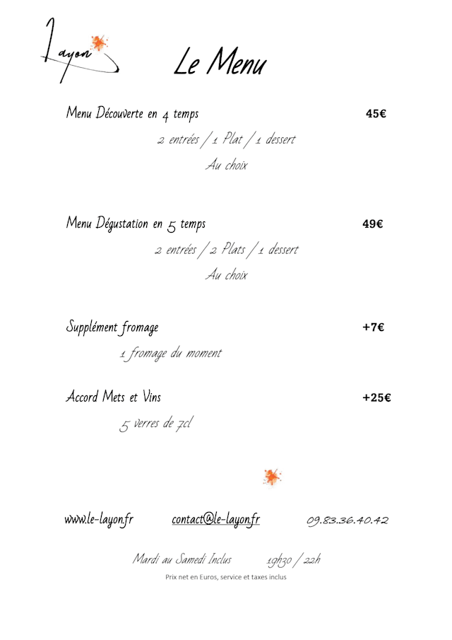 10/10Excellent, rather innovative and sophisticated food. The Chef obviously masters his art! We tried two different red wines, a côtes-du-rhône and a cahors. Both, as most on the list, were organic, light but with pleasant nuances. Overall, an enjoyable dinner in a plain, quiet and comfortable setting, with a friendly, attentionate service. We can only recommend the Layon in confidence!