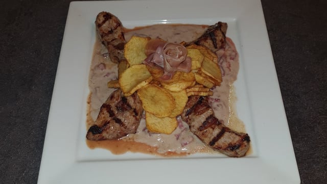 Crème fraiche, ail, oignons et accompagnement au choix (frites, riz, salade)