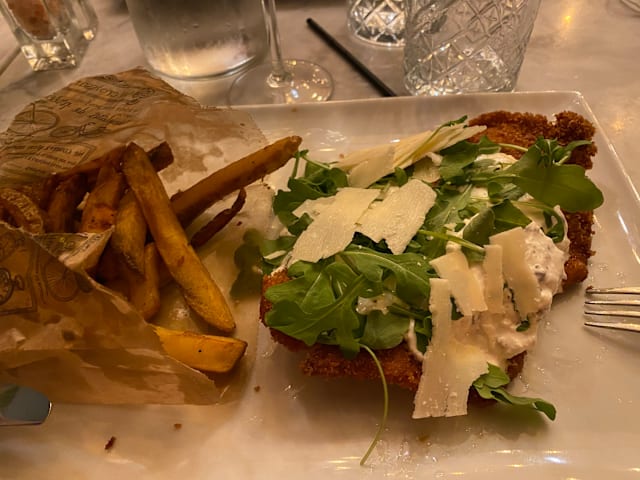 Escalope panée par nos soins, coppa, sauce champignons, mozzarella, emmental, gratinée au four, salade, frites maison