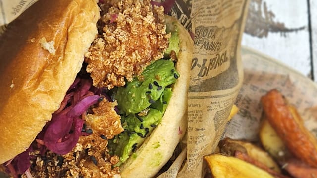 Poulet frit pan ko mariné gingembre, avocat, choux rouge et blanc, sauce ketchup, soja, graine de sésame frites de pomme de terre patate douce carotte cheddar fondu