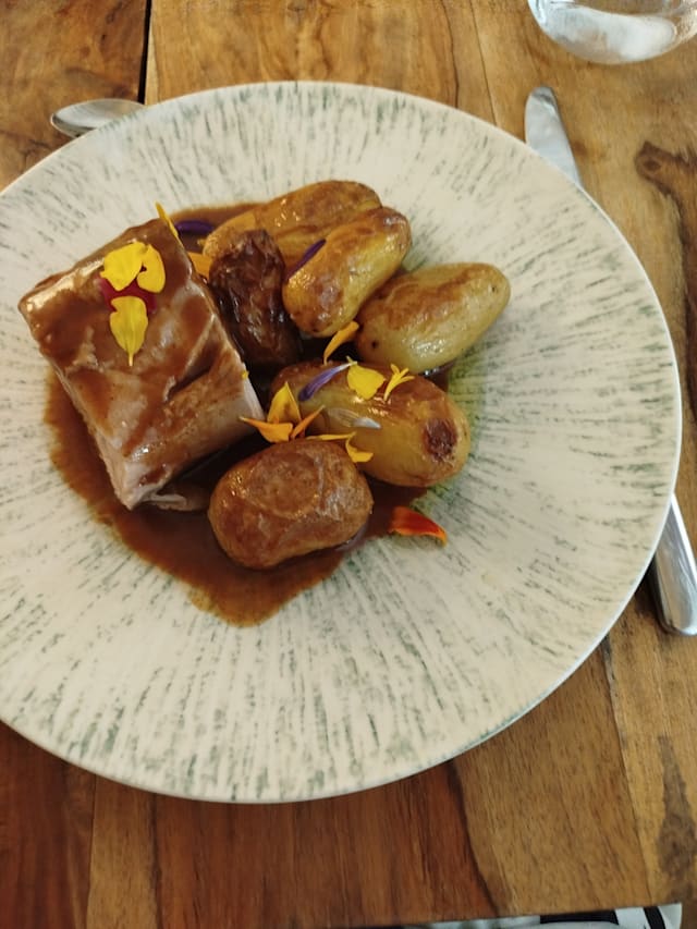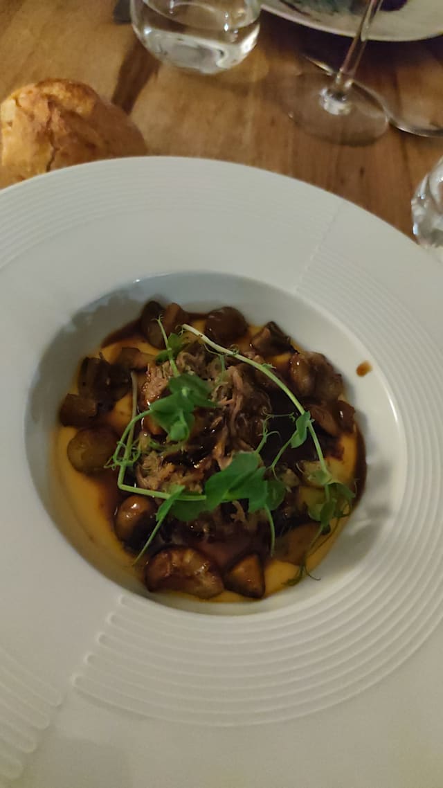 Effiloché d’agneau, jus corsé, crème de butternut, châtaignes grillées et champignons de saison