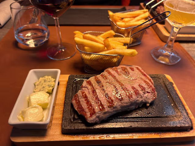 - Nos viandes sur pierrade sont accompagnées de : pommes frites, légumes et beurre café de paris