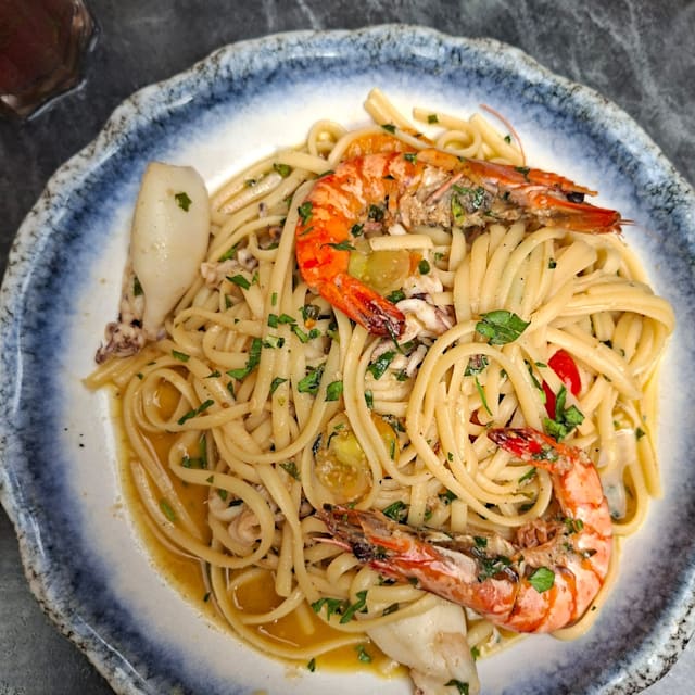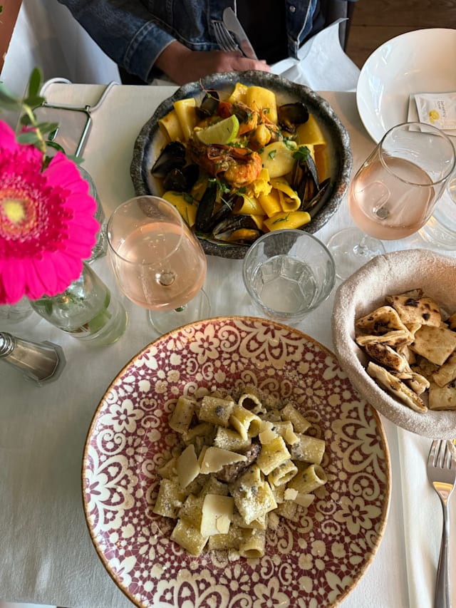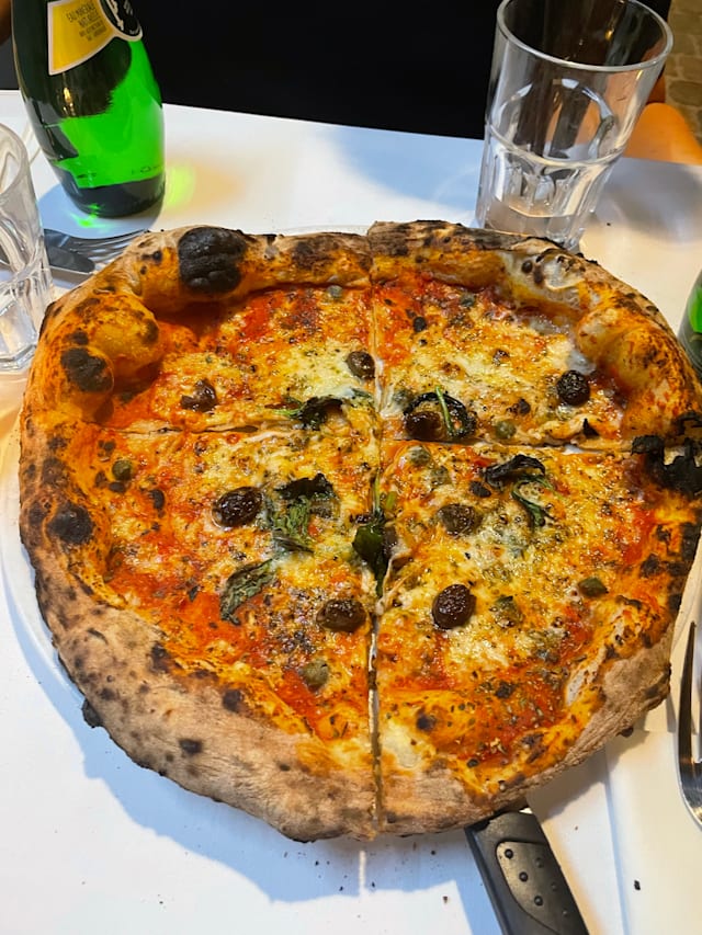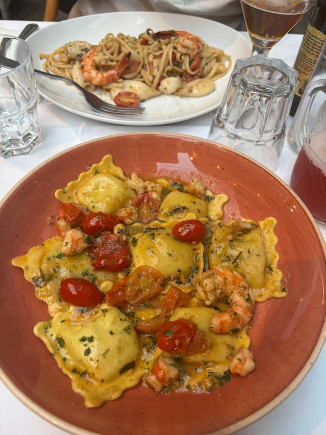 9/10I wasn't very hungry. Had a delicious Negroni, then the ravioli with jumbo shrimp in a savory butter sauce. One of the most delicious things I've ever eaten in my life. Very generous portion. Highly recommended. Try to sit outside if you can gets a little hot in the room with the pizza oven. By the way, the pizza looks incredible.
