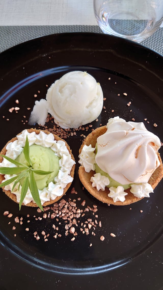 Tartes au citron et géranium, éclats de meringues aux noisettes, sorbet citron vert / Lemon and geranium pies, slivers of hazelnut meringues, lime sorbet