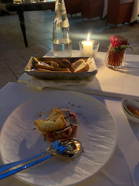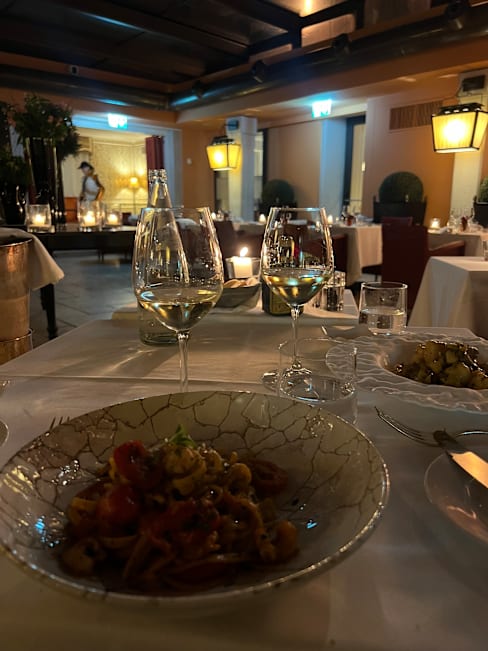 7.5/10We chose this place based on the rave reviews. The food we ordered was great (all except for crostata dessert, which was odd and very lucklaster). The service was very tentative and super slow, even though there were definitely enough personnel available for the amount of guests. The kicker was the additional charge of €8 per person (as was explained to us was for "linen napkins" and bread - which we didn't ask for). As for ambience, there was a lot of folks passing in and out at the hotel, which was a bit of a distraction.