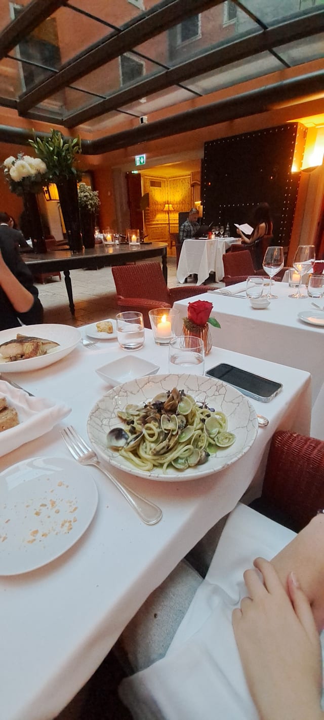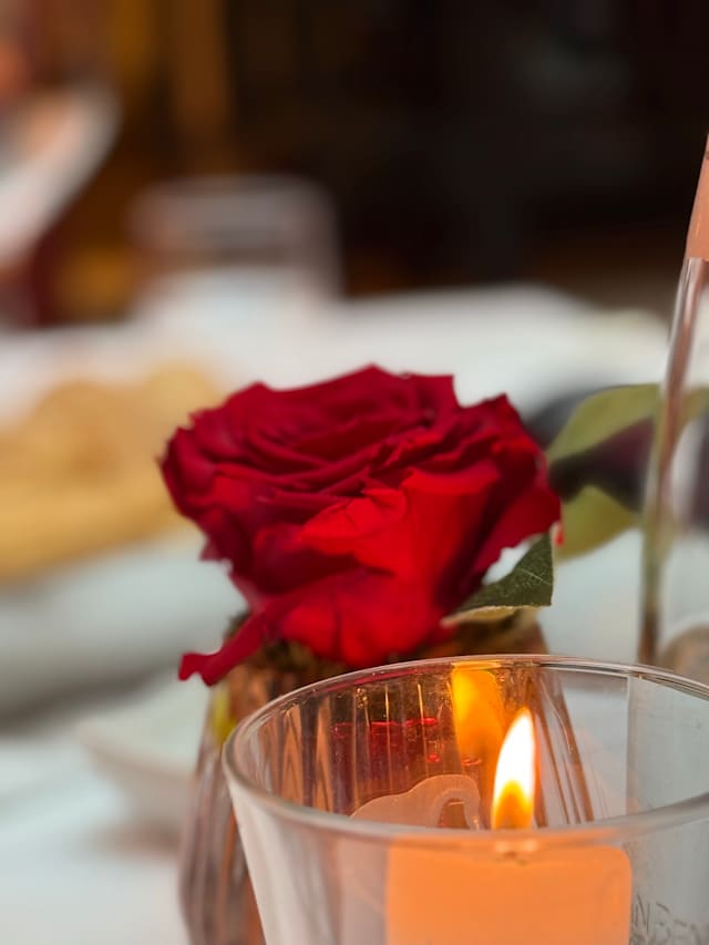 10/10A lovely table adorned with red roses and candles, with a glass ceiling offering a view of the outside. The winter vegetable antipasto with cream sauce was absolutely delightful.
