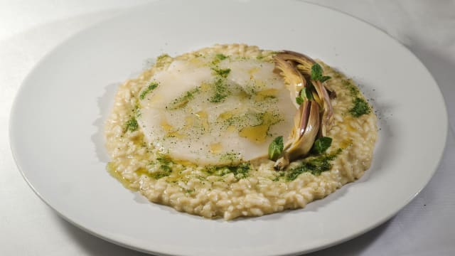 Con carciofi aromatizzati alla menta, crema di topinambur e terra d’olive taggiasche