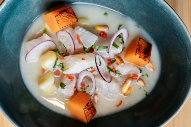 Dorade, leche de tigre, pomme de terre douce, maïs grillés, choclo, oignon rouge, piment péruvien et coriandre