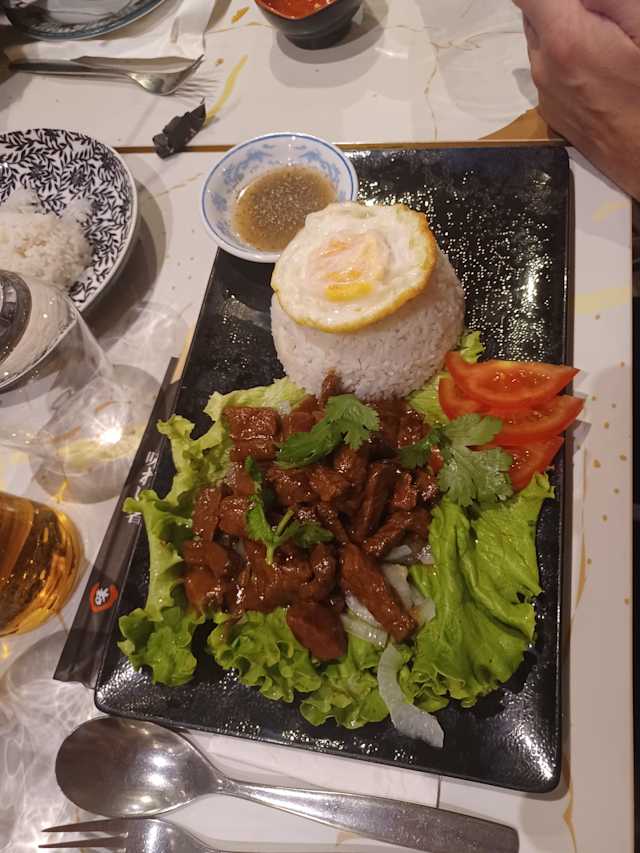 - Bœuf mariné à la sauce soja, sauce huître, ail et poivre, sauté, servi avec riz, œuf, crudités et sauce citron poivre.. Servi avec riz blanc (par défaut).