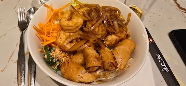 - Nems crevettes et crevettes sautées aux oignons. Soja, carotte, salade, menthe, vermicelles et cacahuètes.