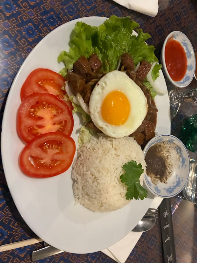 Bœuf mariné à la sauce soja, sauce huître, ail et poivre, sauté, servi avec riz, œuf, crudités et sauce citronpoivre. Servi avec riz blanc.