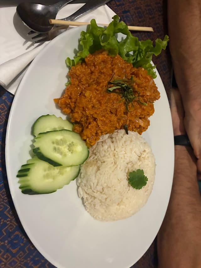 Porc haché au lait de coco, oignons, sauce tomate, tom yum (citronnelle) et feuilles de combawa. Servi avec riz blanc.