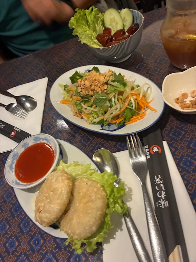 Galettes de poisson. Vermicelles, salade, carotte, soja, feuilles de menthe, cacahuètes, papaye verte