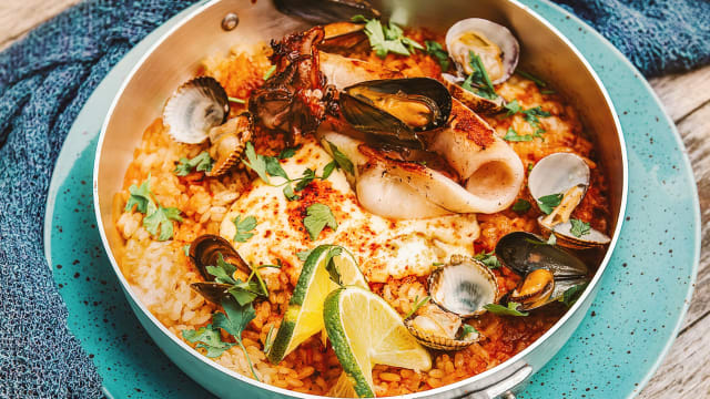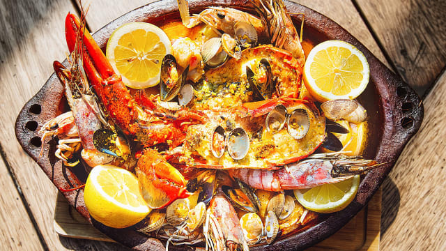 - Lotte, homards, calamars, langoustines, gambas, mélange de coquillages, pomme de terre (per pers.)