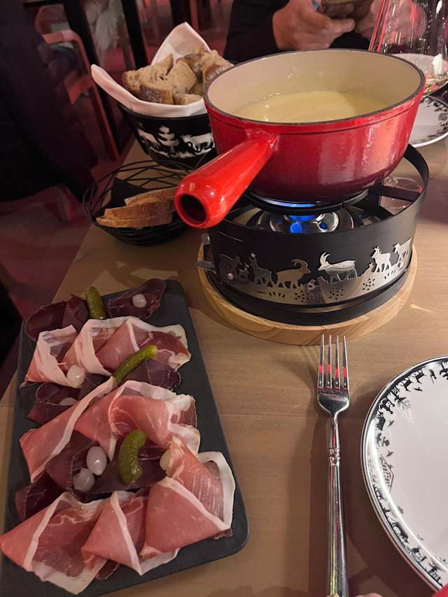 - Gruyère & vacherin 220 gr, champagne, pain, oignons, cornichons
